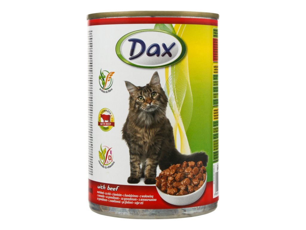 Dax konzerva pre mačky hovädzie 415g je kompletné a chutné krmivo, špeciálne navrhnuté na uspokojenie nutričných potrieb dospelých mačiek. Táto konzerva obsahuje výživné hovädzie mäso, ktoré poskytuje dôležité bielkoviny, vitamíny a minerály potrebné pre zdravie a vitalitu vašej mačky.