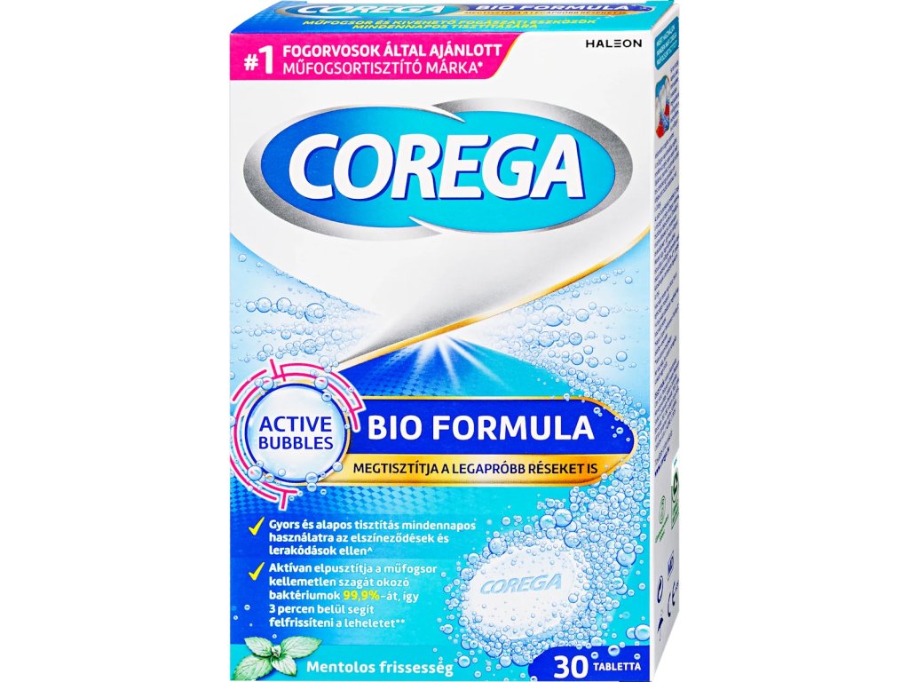 Corega Tabs Bio sú tablety pre každodenné čištenie zubných náhrad. Corega Tabs Bio majú zloženie, ktoré ničí 99,99 %* baktérií a kvasinek, které môžu spôsobiť podráždenie úst a ďasien, nepríjemný zápach z úst, stomatitídu spôsobenú nosením zubnej náhrady.
